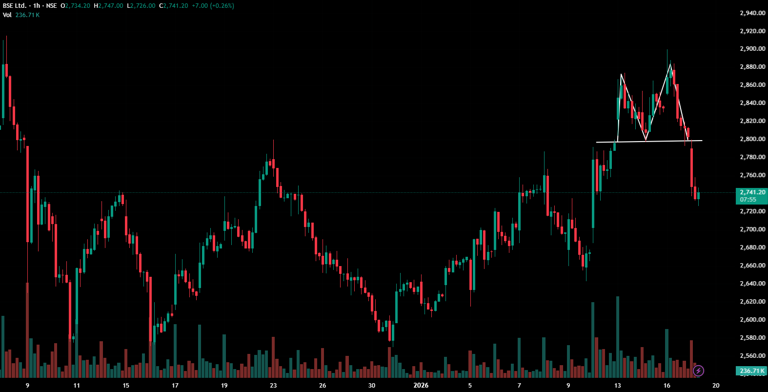 Synopsis: BSE Ltd has exhibited a bearish reversal pattern on its 1‑hour chart, signalling potential near-term downward momentum.