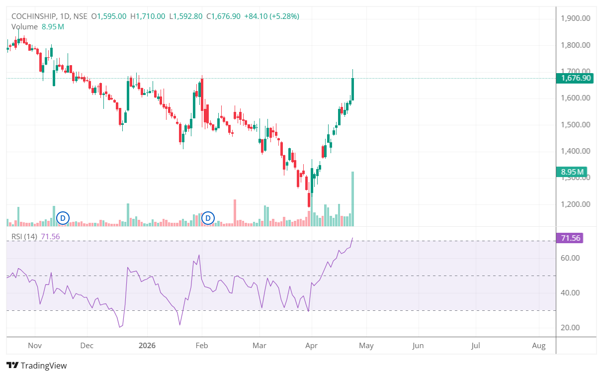 Cochin Shipyard Surges 7% on ₹21,000 Cr Order Book; RSI Signals Near-Term Pause