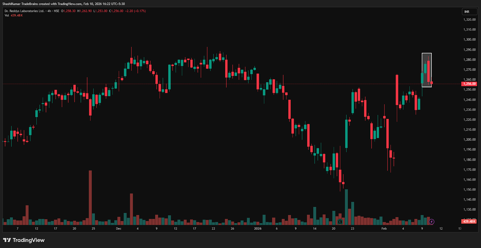 On Tuesday, Dr Reddy’s Laboratories Ltd formed a bearish engulfing pattern on the 4-hour timeframe near the Rs 1,258 level. The strong red candle signalled increased selling pressure. A sustained move below Rs 1,258 could open the door for further downside, while a recovery above this level would weaken the bearish outlook.