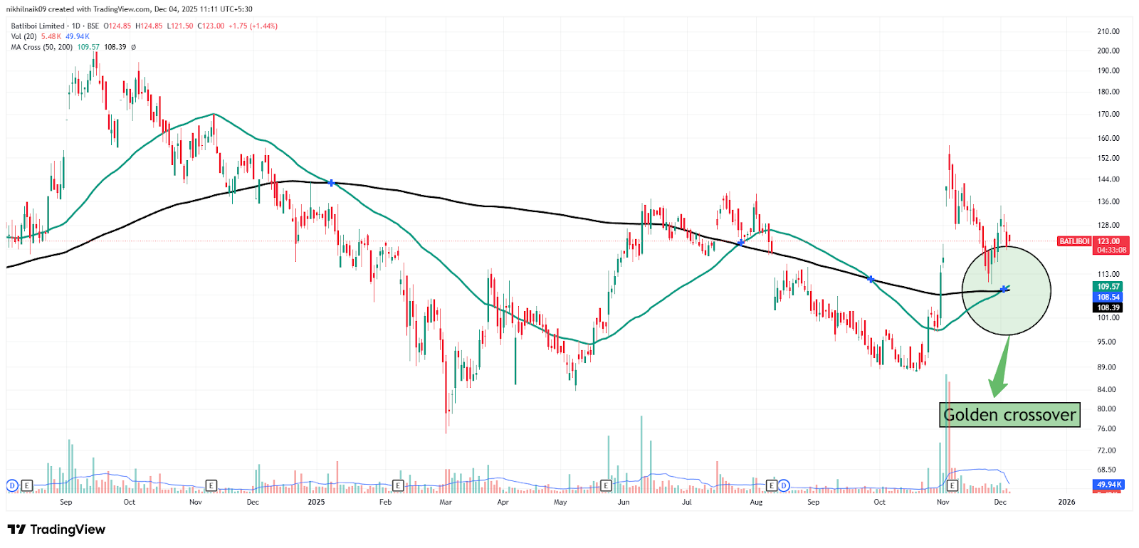 The golden crossover took place on December 02, 2025, at a price of Rs. 108.54 with strong volumes of 13.95 K shares. The stock closed at Rs. 118.20 in Thursday’s session, reflecting a 2.52 percent decrease in the intraday trade.