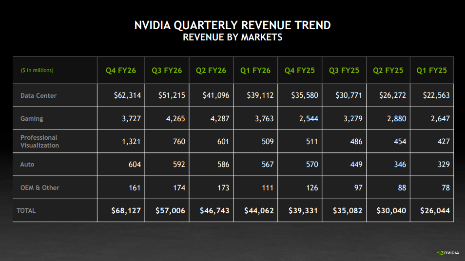Gaming revenue came in at USD 3.7 billion for the quarter, increasing 47 percent year-on-year due to strong Blackwell demand but declining 13 percent sequentially as channel inventory normalized after the holiday season. Full-year Gaming revenue rose 41 percent to a record USD 16.0 billion. The company indicated that supply constraints are expected to weigh on Gaming in the first quarter of fiscal 2027 and potentially beyond.