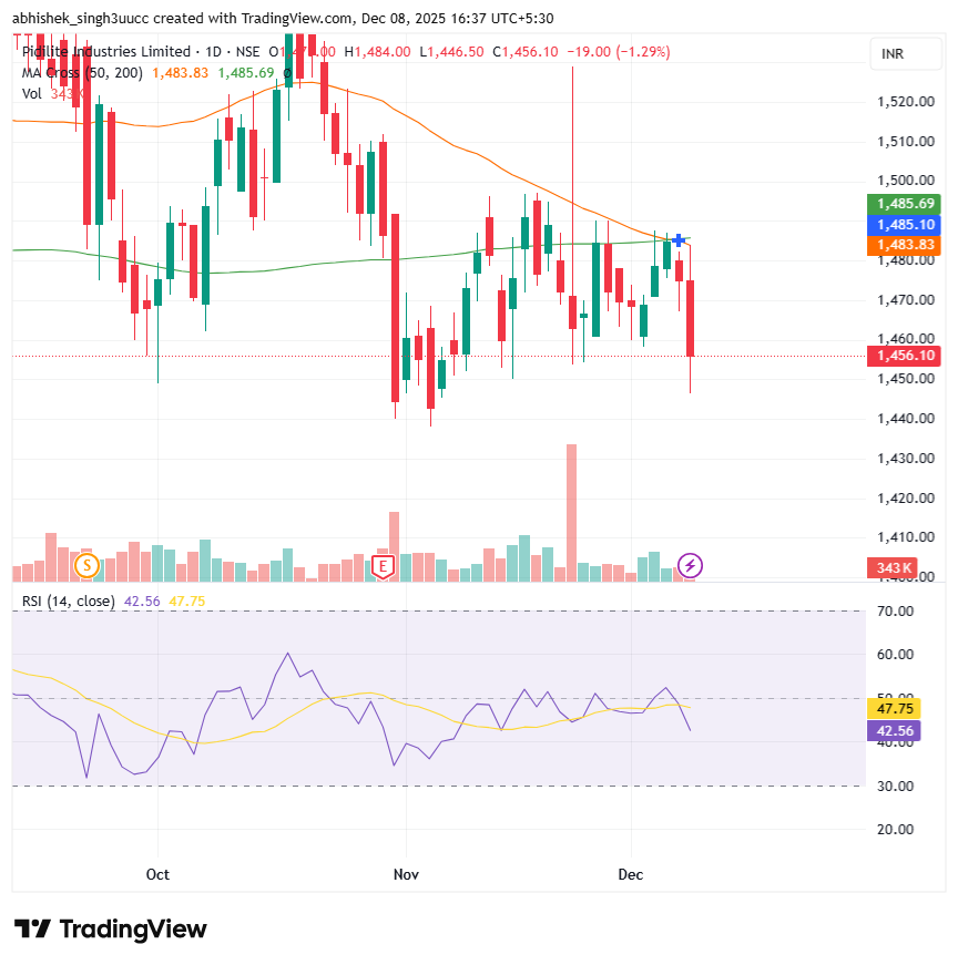 A death crossover occurred on December 5, 2025, at Rs 1,485 with a trading volume of 328.47K, signalling potential bearish momentum. The stock closed at Rs 1,457 on Monday, down 1.18% intraday, suggesting continued selling pressure and possible short-term weakness in investor sentiment.