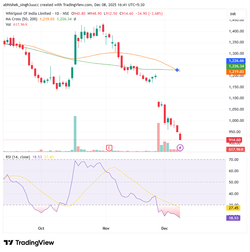 A death crossover occurred on December 5, 2025, at Rs 1,226 with a trading volume of 722.42K, signalling potential bearish momentum. The stock closed at Rs 915.30 on Monday, down 3.60% intraday, suggesting continued selling pressure and possible short-term weakness in investor sentiment.
