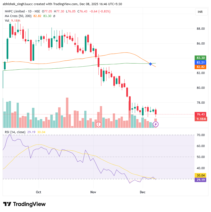 A death crossover occurred on December 4, 2025, at Rs 83.21 with a trading volume of 5.54M, signalling potential bearish momentum. The stock closed at Rs 76.4 on Monday, down 0.87% intraday, suggesting continued selling pressure and possible short-term weakness in investor sentiment.