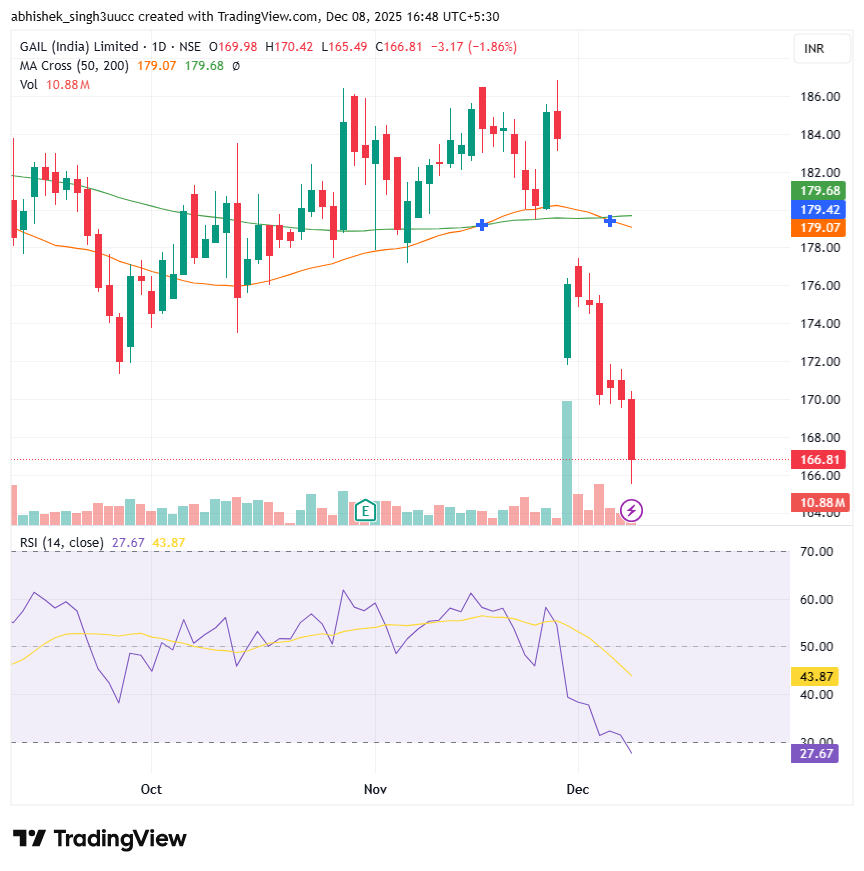 A death crossover occurred on December 4, 2025, at Rs 179.42 with a trading volume of 7.62M, signalling potential bearish momentum. The stock closed at Rs 167 on Monday, down 1.82% intraday, suggesting continued selling pressure and possible short-term weakness in investor sentiment.