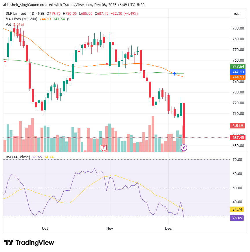 A death crossover occurred on December 3, 2025, at Rs 747.13 with a trading volume of 1.4M, signalling potential bearish momentum. The stock closed at Rs 687 on Monday, down 4.51% intraday, suggesting continued selling pressure and possible short-term weakness in investor sentiment.
