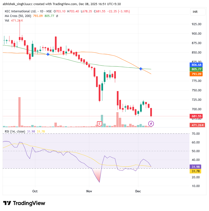 A death crossover occurred on December 2, 2025, at Rs 806.68 with a trading volume of 1.65M, signalling potential bearish momentum. The stock closed at Rs 678 on Monday, down 3.43% intraday, suggesting continued selling pressure and possible short-term weakness in investor sentiment.
