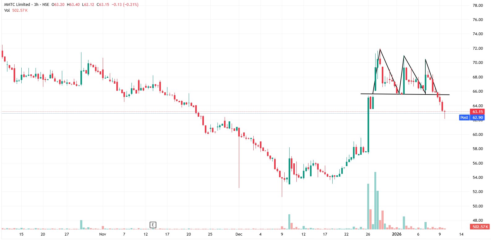On Friday, MMTC share price broke below the Rs 65.6 support neckline after forming a Triple top pattern. This breakdown, accompanied by continuous selling, confirms near-term bearish momentum.