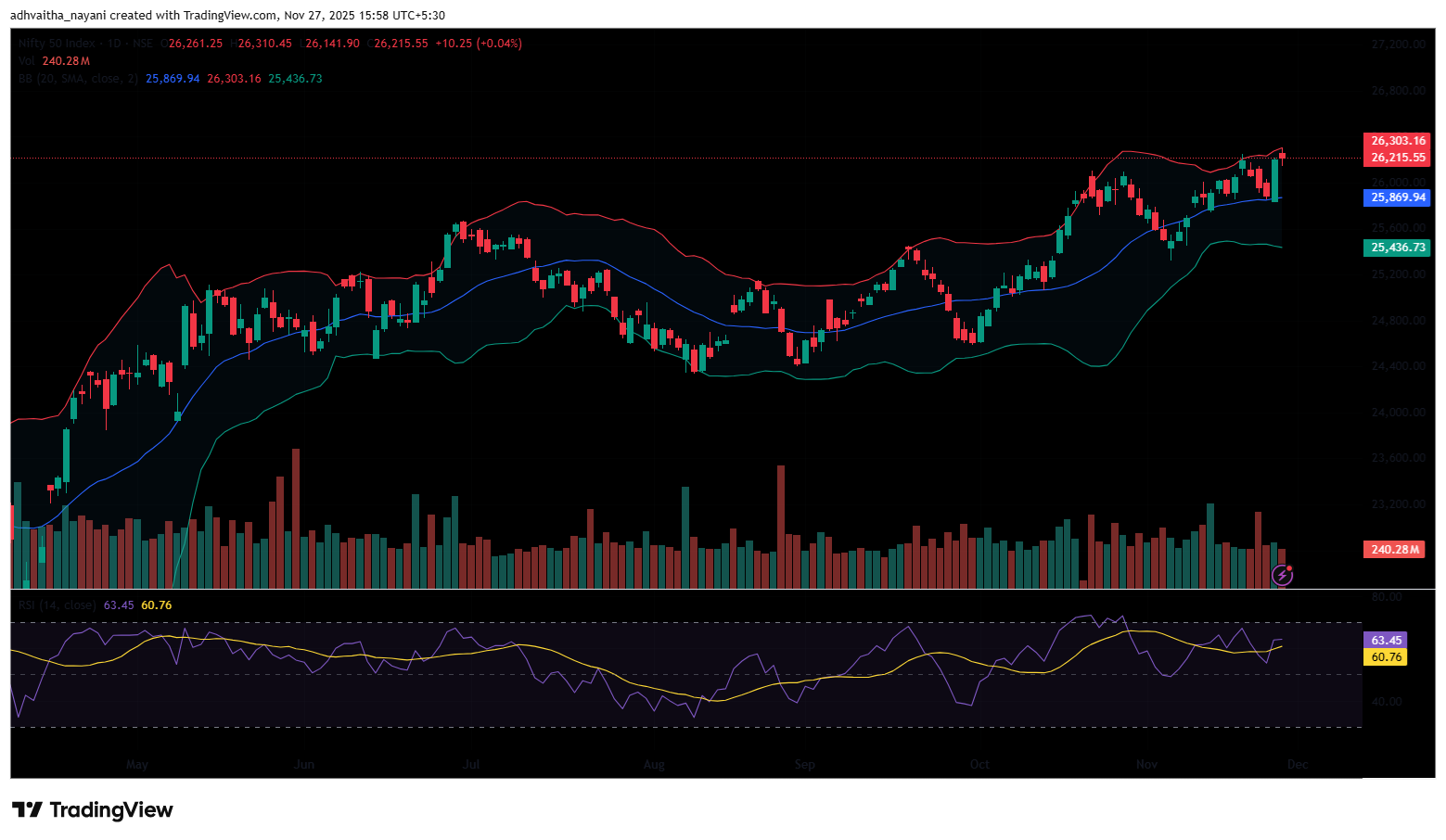 Bollinger Bands (Daily): The index is comfortably trading in the upper band of the Bollinger Band range. Its position in the upper range suggests a bullish sentiment in the short term. However, on Thursday’s session, the Index formed a doji-like candlestick pattern, which indicates indecisiveness. The index took support near 25,145 and sustained above the 26,200 level. A sustained move above the middle band signals a bullish sentiment, while a drop back toward the lower band may reinforce bearish sentiment.