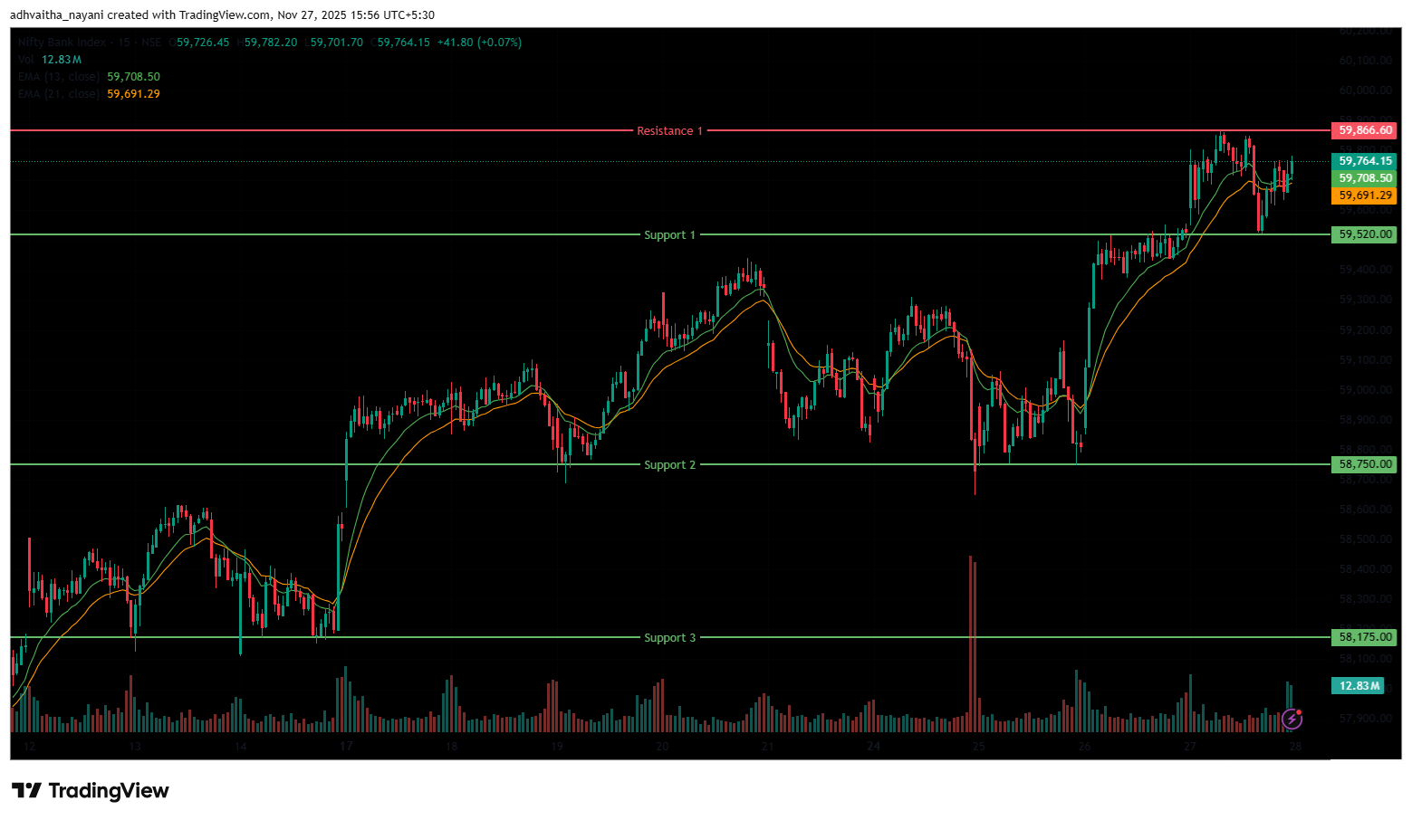 The nearest resistance is at 59,866.60 (R1), which is the all-time high for the index. On the other hand, the closest support is now at 59,520 (S1), and the next support is at 58,750 (S2), where the index has taken support at this level previously. If the index falls below this, the next major support level to watch is at 58,175 (S3).