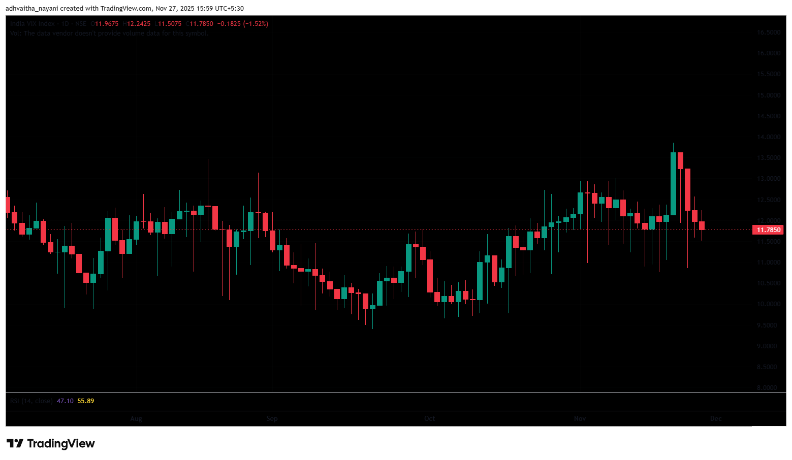 The India VIX fell 0.18 points (1.52%) from 11.97 to 11.79 during Thursday’s session, indicating a downtrend in expected market volatility. However, overall volatility remains low, since the India VIX is generally considered elevated only when it rises above 15.