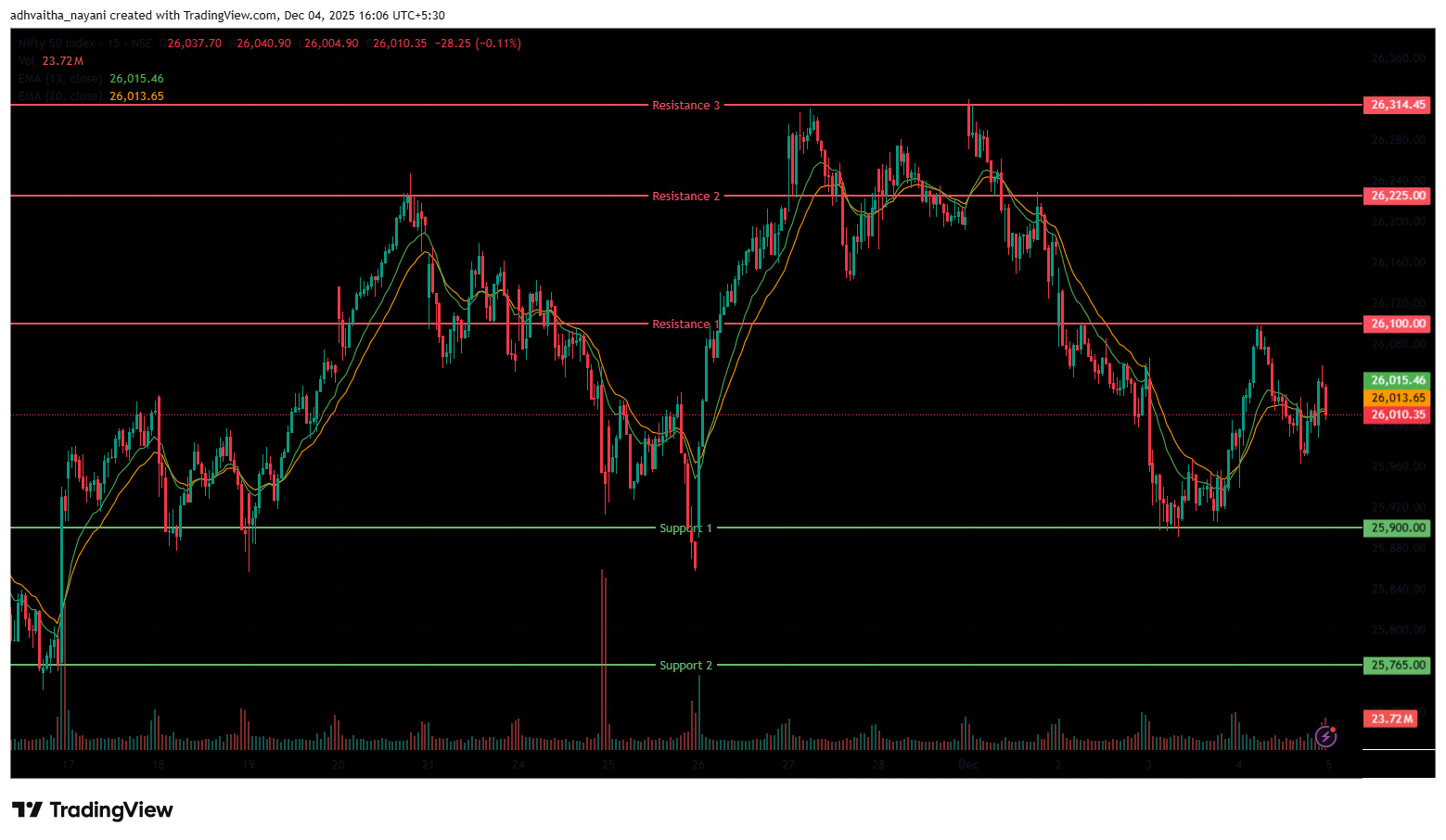 The Nifty 50’s nearest resistance levels are at 26,100 (R1) and 26,225 (R2), the level at which it failed to sustain above, and its next resistance is at 26,314.45 (R3). On the other hand, the closest support is now at 25,900 (S1), and the next one at 25,765 (S2), which were previous resistances now acting as support.