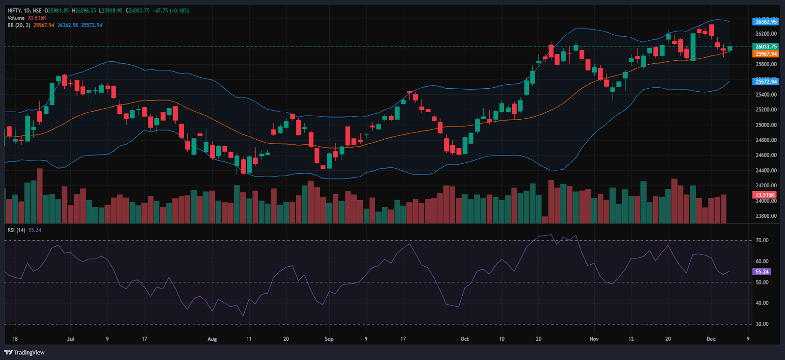 Bollinger Bands (Daily): The index is trading in the upper band of the Bollinger Band range and nearing the middle band. Its position in the upper range suggests a bullish sentiment in the short term. However, on Thursday’s session, the Index formed a bullish candlestick pattern, with a long wick up and a small wick down, indicating bullish. The index stayed above the 26,000 level on Thursday’s session and was hovering near the 26,050 level. A sustained move above the middle band signals a bullish sentiment, while a drop back toward the lower band may reinforce bearish sentiment.
