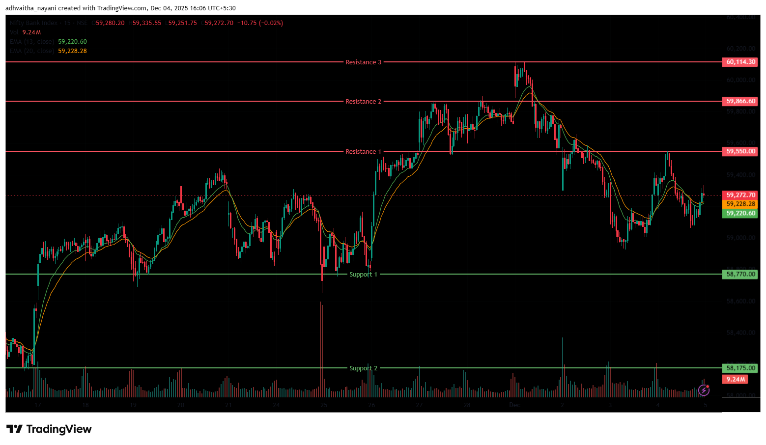 The nearest resistance is at 59,550.00 (R1) and 59,866.60 (R2). The higher resistance is at 60,114.30 (R3), which is the all-time high for the index. On the other hand, the closest support is now at 58,770 (S1), and the next support is at 58,175 (S2), where the index has taken support at this level previously.