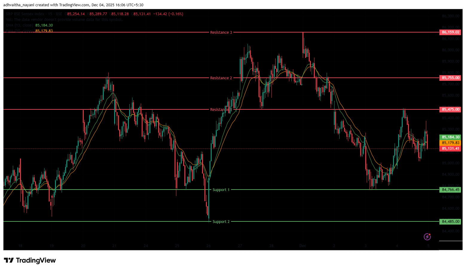 SensexResistance 386,159.02Resistance 285,755.00Resistance 185,475.00Closing Price85,265.32Support 184,766.45Support 284,485.00Market Recap on December 4th, 2025