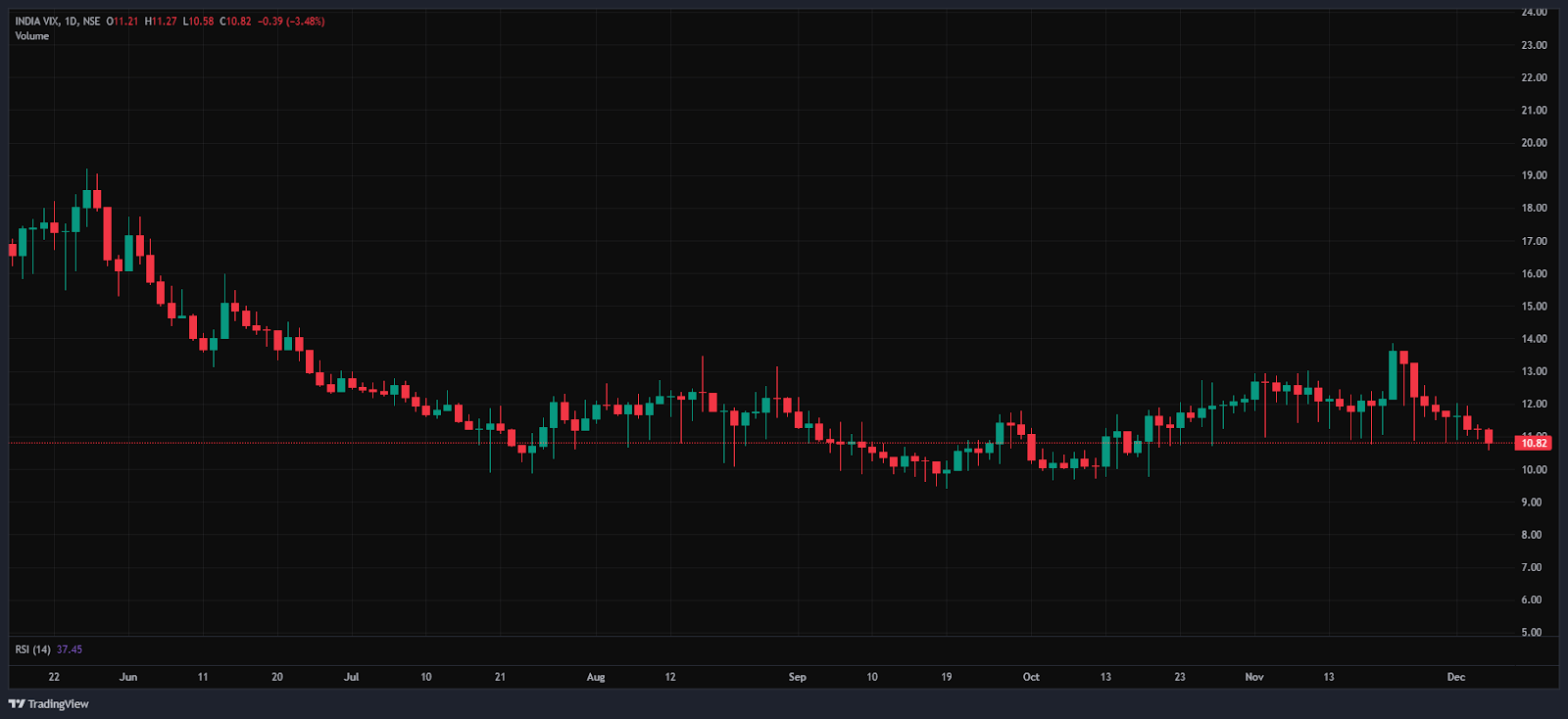 The India VIX fell to 10.82, down by 0.39 points (3.48%) during Thursday’s trading session, indicating stable sentiment in expected market volatility in the daily time frame. However, overall volatility remains low, since the India VIX is generally considered elevated only when it rises above 15.