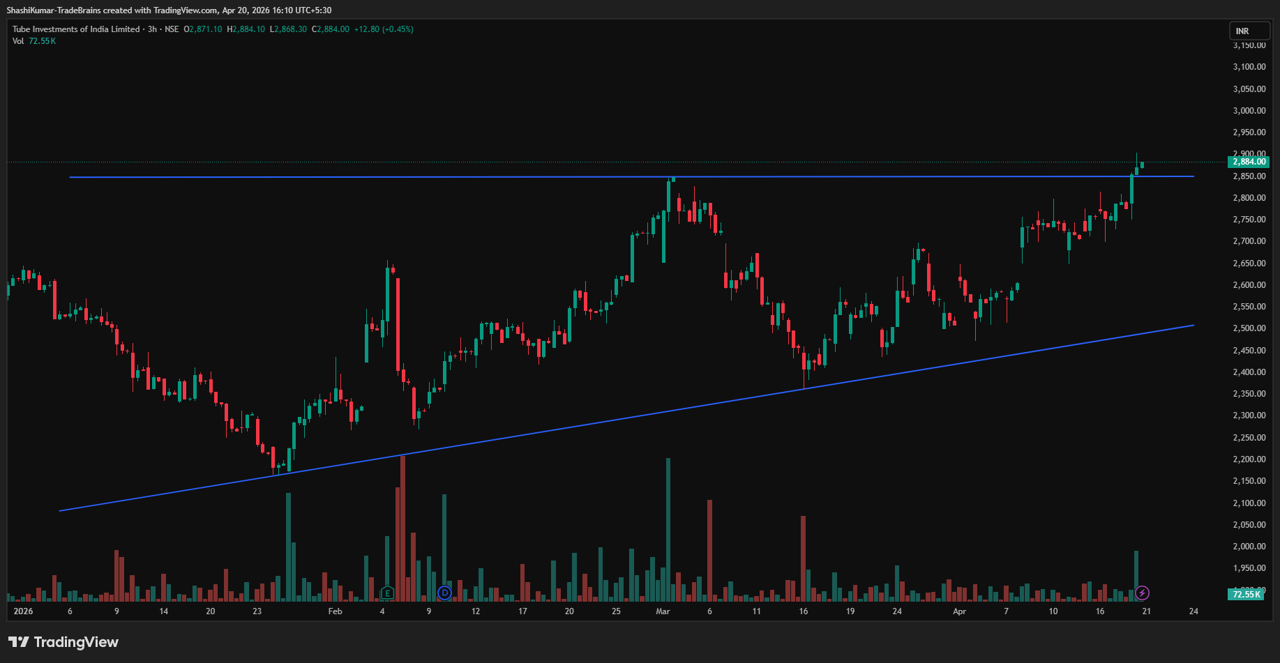 Synopsis: Tube Investments of India Ltd has formed an ascending triangle pattern on the 3-hour chart, indicating a possible short-term bullish breakout.
