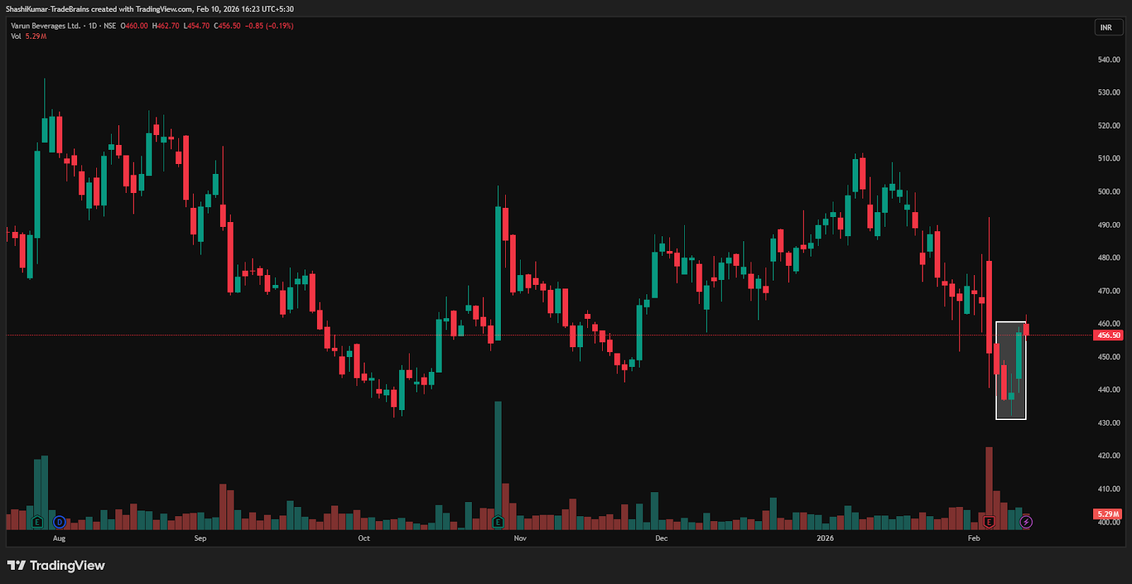 On Tuesday, Varun Beverages Ltd formed a morning star pattern on the daily timeframe near the Rs 457 level. The formation signalled a potential shift in momentum as buyers started regaining control after recent weakness. A sustained move above Rs 457 could support further upside, while a drop below this level would weaken the bullish outlook.