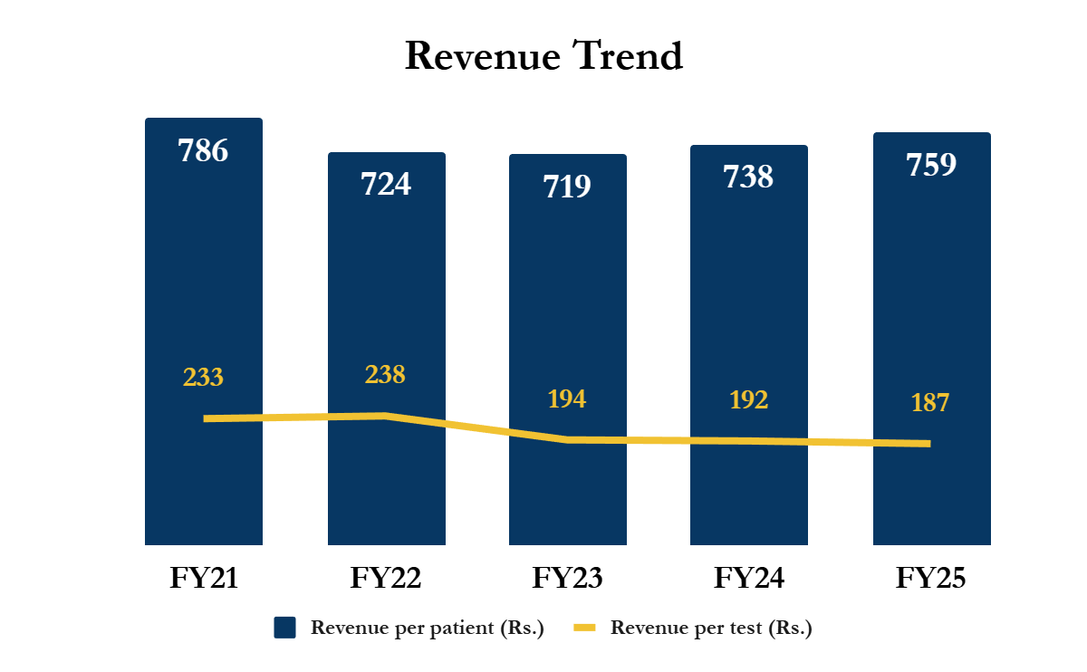 Most of the revenue growth has come from rising volumes. Patient footfall grew at 12% CAGR, while the number of samples collected expanded even faster at 17% CAGR. As big diagnostic chains continue to expand, they are capturing more of this growing demand and helping the industry become more organized. However, competitive pressures have pushed prices downward: revenue per patient fell from Rs 786 in FY21 to Rs 759 in FY25, and revenue per test dropped from Rs 233 to Rs 187 over the same period.