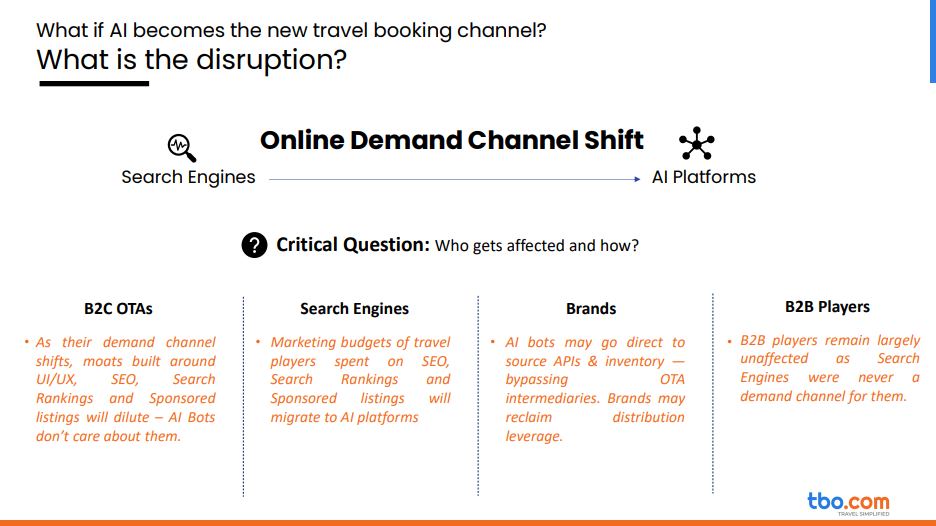 That distinction matters because TBO directly argues that AI may become the new booking demand channel and shift traffic away from search engines, OTAs and front-end interfaces. It says moats built around UI, SEO, search rankings and sponsored listings could weaken because AI bots do not care about them, while B2B players remain largely unaffected because search engines were never the main demand channel for them.