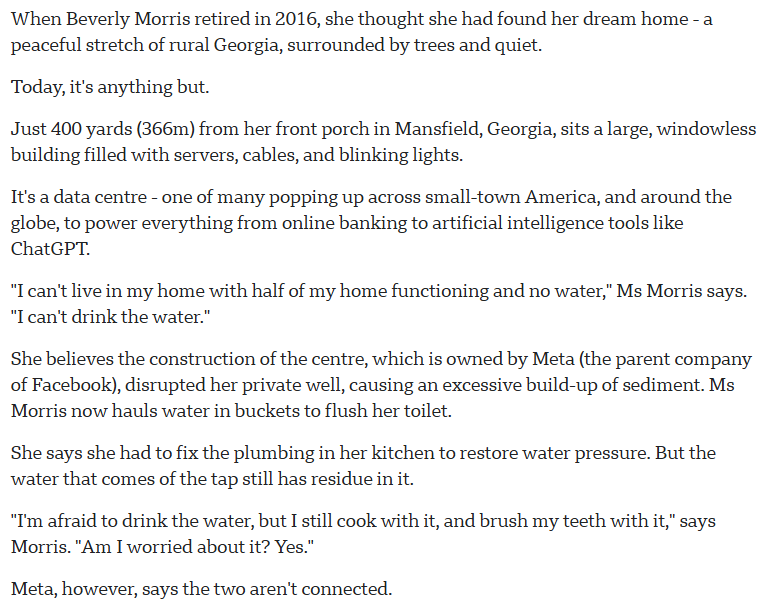 Concerns about water impacts have also emerged in communities located near data centre developments. A report by the BBC highlighted the experience of Beverly Morris, a resident of Mansfield, Georgia, whose home is located about 400 yards from a large data centre owned by Meta. Morris believes construction of the facility disrupted her private well, causing excessive sediment buildup and water pressure problems in her home. She now hauls water in buckets to flush her toilet and says the tap water still contains residue. Meta has denied any connection between the facility and the groundwater issues, stating that an independent study found no evidence that the data centre affected local groundwater conditions.