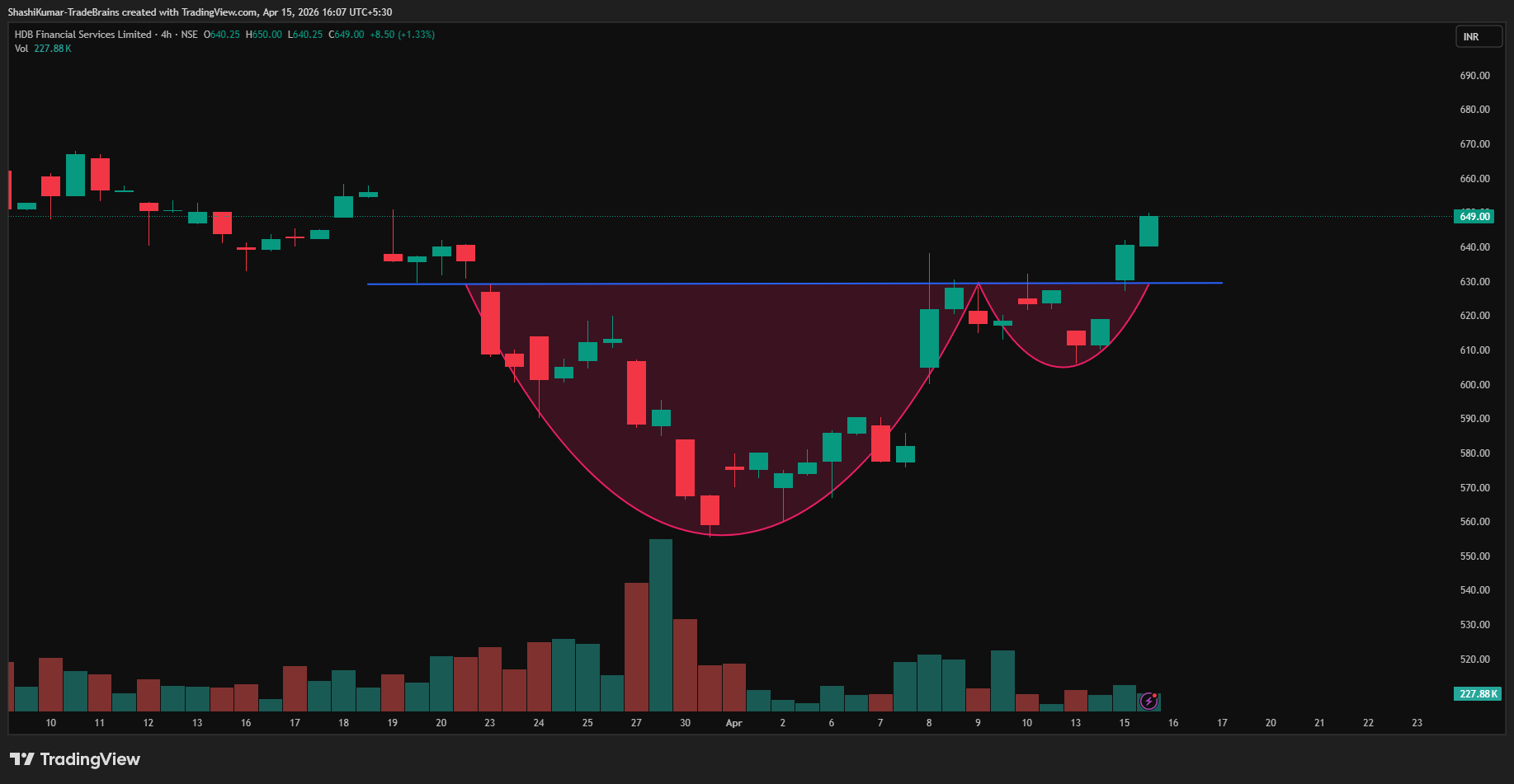 Synopsis:HDB Financial Services Ltd has developed a cup-and-handle pattern on the 4-hour chart, indicating a bullish continuation or trend reversal.